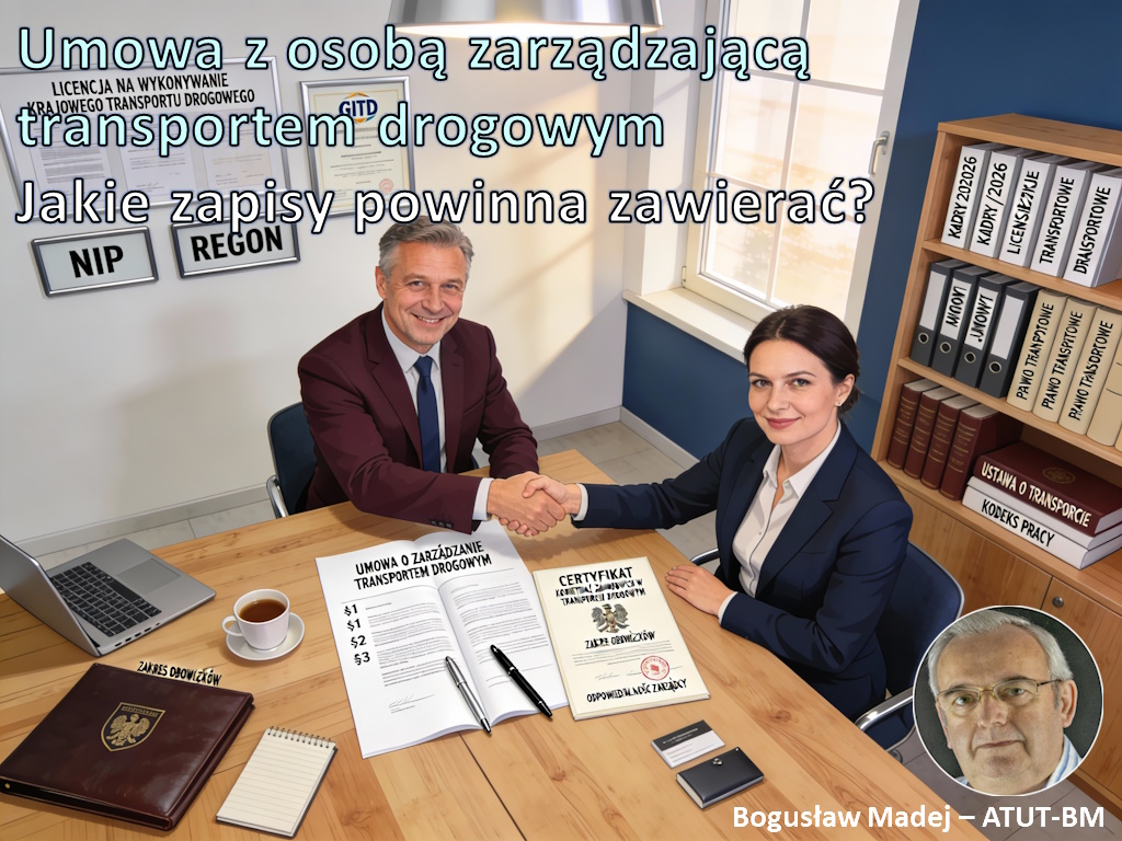 Przepisy unijne i krajowe nakładają szczególne wymagania na formę i treść umowy z osobą zarządzającą transportem. Rozporządzenie Parlamentu Europejskiego i Rady nr 1071/2009 wyraźnie wskazuje, że umowa ta musi precyzować zadania wykonywane w sposób rzeczywisty i ciągły oraz określać dokładny zakres obowiązków. Nie jest to jedynie formalność – kontrolerzy GITD weryfikują zgodność zapisów umowy z faktycznym zakresem działań zarządzającego. Brak spójności między dokumentem a rzeczywistością może prowadzić do uznania, że przedsiębiorstwo nie spełnia warunku posiadania kompetencji zawodowych, co automatycznie oznacza niemożność prowadzenia działalności transportowej.